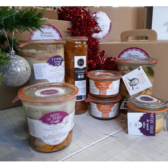 Ce coffret comprend : une Garbure 760g, deux cuisses de canard confites 750g, Un bocal de Ratatouille de Gascogne 560g, un foie gras 150g, un rôti de porc confit 400g, un pâté de Chevreuil 150g et un pâté pur porc 150 g