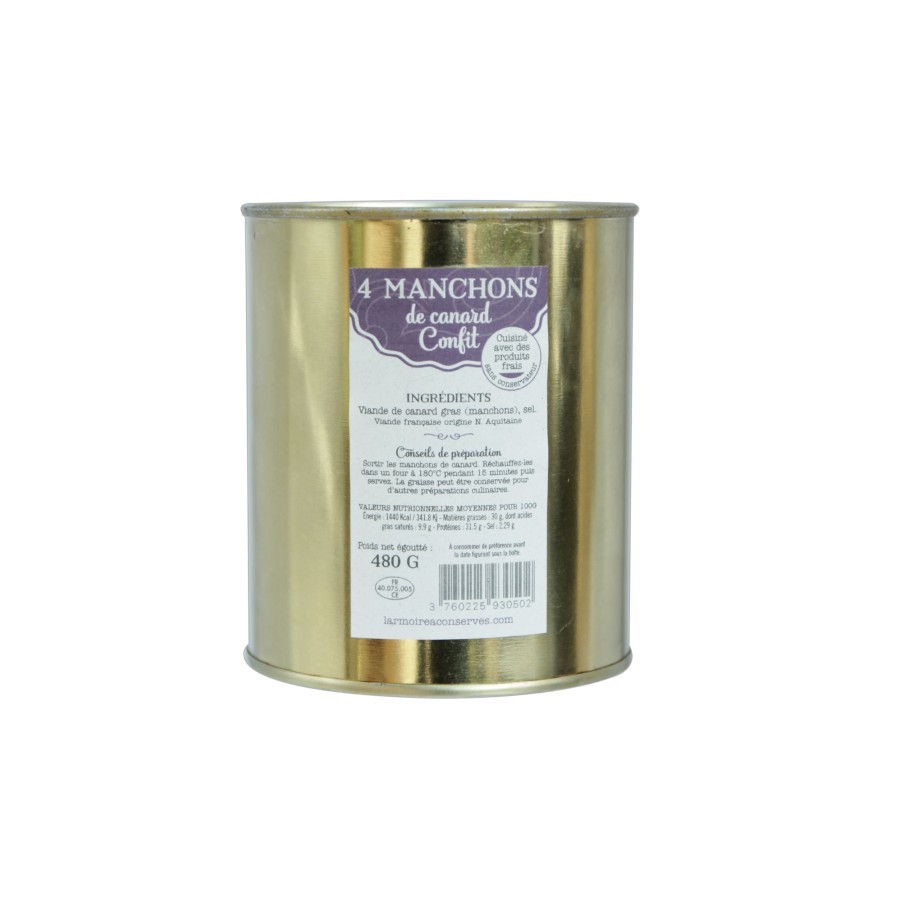 Plus léger que la cuisse, le manchon se sert traditionnellement l'été, à la tombée de la nuit avec une belle salade Landaise, ou bien l'hiver, devant la cheminée, avec un beau plat de haricots Tarbais. Composition : manchons de canard gras du Sud Ouest, graisse, sel.